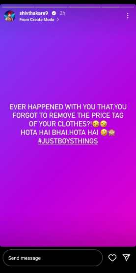 “तुम्ही कधी तुमच्या कपड्यांवरील किंमतीचा टॅग काढायला विसरला आहात का? तुमच्याबरोबरही असं कधी काही घडलं आहे का? असं होतं भावा, अनेकदा होतं”, असे शिवने इन्स्टाग्रामवर पोस्ट केलेल्या स्टोरीत म्हटले आहे. त्याबरोबर त्याने ‘मुलांच्या गोष्टी’ असा हॅशटॅगही दिला आहे.