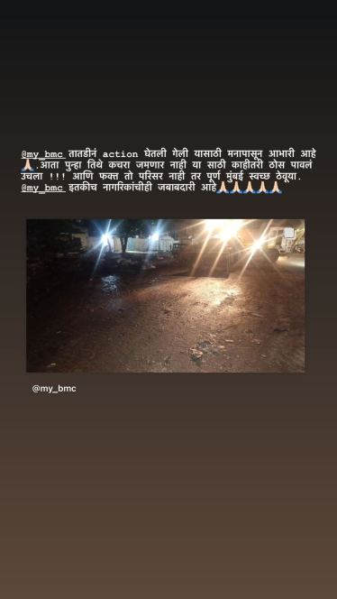 शशांक केतकरने इन्स्टाग्राम स्टोरीवर स्वच्छ केलेल्या जागेचा फोटो शेअर करत लिहिलं, “मुंबई महानगरपालिकेने तातडीनं कारवाई केली यासाठी मनापासून आभारी आहे. आता पुन्हा तिथे कचरा जमणार नाही यासाठी काहीतरी ठोस पावलं उचला आणि फक्त तो परिसर नाही तर पूर्ण मुंबई स्वच्छ ठेवूया. मुंबई महापालिके इतकीच नागरिकांचीही जबाबदारी आहे.”