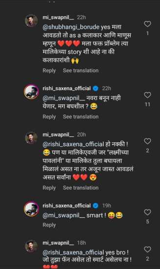 यावर प्रतिक्रिया देत ऋषी म्हणाला, “नवरा बनून नाही येणार, मग बघशील?” त्यावर चाहता म्हणाला, “हो नक्की. पण या मालिकेऐवजी जर ‘लक्ष्मीच्या पाऊलांनी’ मालिकेत तुला बघायला मिळालं असतं ना तर अजून जास्त आवडलं असतं सर्वांना.” चाहत्याच्या या प्रतिक्रियेवर अभिनेता हसत म्हणाला, “स्मार्ट.”
