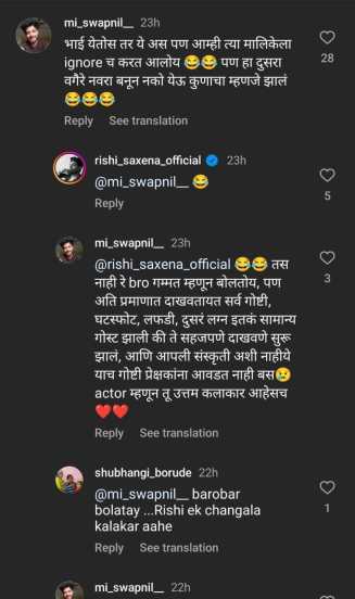 याच व्हिडीओवर एक चाहता म्हणाला, “भाई येतोस तर ये, असं पण आम्ही त्या मालिकेला दुर्लक्षचं करत आलोय. पण हा दुसरा वगैरे नवरा बनून नको येऊ कुणाचा म्हणजे झालं.” चाहत्याच्या या प्रतिक्रियेवर ऋषीने फक्त हसण्याचा इमोजी दिला. त्यानंतर चाहता आणखी एक प्रतिक्रिया देत म्हणाला, “तसं नाही रे ब्रो..,गंमत म्हणून बोलतोय. पण सर्व गोष्टी अति प्रमाणात दाखवतायत. घटस्फोट, लफडी, दुसरं लग्न इतकं सामान्य गोष्ट झाली की ते सहजपणे दाखवणं सुरू झालं आणि आपली संस्कृती अशी नाहीये, याच गोष्टी प्रेक्षकांना आवडत नाही बसं. अभिनेता म्हणून तू उत्तम कलाकार आहेसच.”