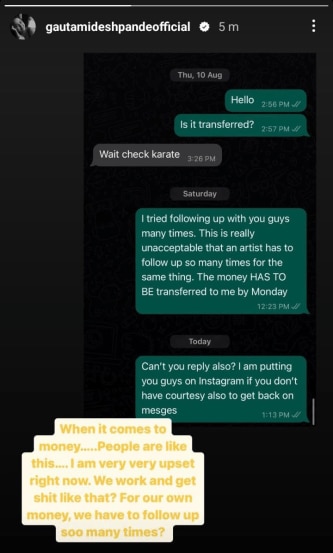 गौतमी देशपाडेंने इन्स्टाग्रामवर मेसेजचा स्क्रीनशॉट शेअर केला आहे. कामाचं मानधन वेळेवर न मिळाल्याने अभिनेत्रीने संतप्त पोस्ट शेअर केली आहे. यामध्ये गौतमीने समोरच्या व्यक्तीला ‘पैसे ट्रान्सफर केले का?’ असा मेसेज केला. यानंतर अभिनेत्रीला ‘थांबा, चेक करते’ असं उत्तर देण्यात आलं. पुढे दोन दिवस उलटूनही पैसे न मिळाल्याने गौतमीने पुन्हा मेसेज करत, “मी तुम्हाला संपर्क करण्याचा अनेकदा प्रयत्न केला. एखाद्या कलाकाराला एखाद्या गोष्टीसाठी एवढ्या वेळा पाठपुरावा करावा लागतो हे खरोखरचं अस्वीकार्य आहे. सोमवारपर्यंत माझे पैसे मला ट्रान्सफर करा.” असं लिहिलं.