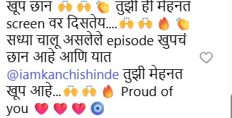 कांची शिंदेच्या या व्हिडीओवर अनेक चाहत्यांनी कमेंट करत तिचे कौतुक केले आहे. “खूपच छान. तुझा अभिमान वाटतो. आजकाल असा अभिनय पाहायला मिळत नाही. डोळ्यात पाणी आलं”, “अंगावर काटा आला”, “बेस्ट सीन”, “तुझा अभिमान वाटतो”, अशा कमेंट करत नेटकऱ्यांनी कौतुक केलं आहे. तर अनेकांनी हार्ट इमोजी शेअर केल्याचे पाहायला मिळत आहे.