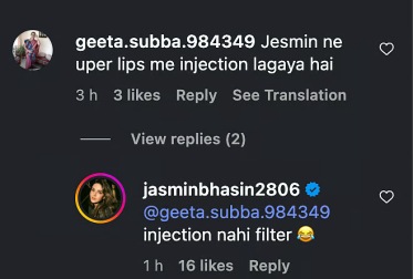 जास्मीनने शेअर केलेल्या या व्हिडीओखाली एका नेटकऱ्याने ‘जास्मीनने ओठांवर इंजेक्शन घेतलं आहे’ अशी कमेंट केली आहे. व्हिडीओखाली कमेंट केलेल्या नेटकऱ्याला जास्मीननेही उत्तर दिलं आहे. ती म्हणाली, “इंजेक्शन नाही फिल्टर आहे.” जास्मीनने हा व्हिडीओ काल बुधवारी १८ जून रोजी शेअर केला होता. आता अभिनेत्रीच्या वाढदिवसाला ९ दिवस बाकी आहेत. जास्मीन नेहमीच सोशल मीडियावर सक्रिय असते. तिच्या दैनंदिन जीवनातील घडामोडी ती सोशल मीडियामार्फत तिच्या चाहत्यांसह शेअर करत असते.