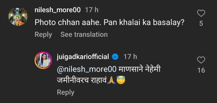 जुईने नुकतेच तिच्या सोशल मीडिया अकाउंटवरून लाल रंगाची नऊवारी साडी नेसलेले काही फोटो शेअर केले. त्यापैकी एका फोटोमध्ये ती जमिनीवर बसलेली दिसत आहे. त्यावर तिच्या चाहत्यांनी कमेंट करत विविध प्रतिक्रिया दिल्या. एका नेटकऱ्याने कमेंट करत लिहिलं, “फोटो चांगला आहे. पण खाली का बसला आहात?” त्या कमेंटला जुईनेही चोख उत्तर दिलं. तिने लिहिलं, “माणसाने नेहमी जमिनीवरच राहावं.”