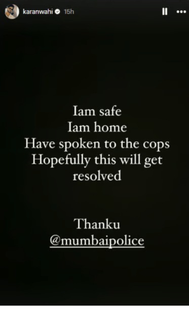 ही घटना घडून गेल्यानंतर थोड्या वेळाने करणने ती स्टोरी इन्स्टाग्रामवरून काढून टाकली. परंतु तोपर्यंत या स्टोरीचे स्क्रिनशॉर्ट सगळीकडे व्हायरल झाले होते. परत एक वेगळी स्टोरी शेअर करत करणने सर्वांना सांगितलं की, तो सुरक्षित आहे आणि त्याने मुंबई पोलिसांबद्दल कृतज्ञता व्यक्त केली. त्याने लिहिले, “मी सुरक्षित आहे, मी घरी पोहोचलो आहे. पोलिसांशी माझं बोलणं झालंय. यावर तोडगा निघेल अशी आशा आहे. धन्यवाद मुंबई पोलीस.”