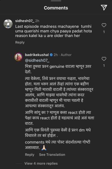 या कमेंटला कुशल उत्तर देत म्हणाला, “मित्रा, तुमचा प्रश्न खरा वाटला म्हणून उत्तर देतो. त्या वेळेला, तिथे प्रश्न वयाचा नव्हता; भावनेचा होता. मला भरून आलं, तेव्हा एक बहीण म्हणून त्यांना मला मिठी मारावीशी वाटली हे त्यांच्या संस्कारातून आलंय आणि माझ्या या भावनेची त्यांना कदर करावीशी वाटली म्हणून मी पाया पडलो हे आपल्या संस्कारातून आलंय, आणि सांगू का? माणूस कसा प्रतिसाद देतो त्यापेक्षा तो व्यक्त कसा होतो हे महत्त्वाचं आहे, असं मला वाटतं. एक विनंती पुढच्या वेळी हे प्रश्न मला मेसेज करून विचारले, तर बरं होईल. कमेंट्समधे त्या पोस्टसंदर्भातल्या गोष्टी असाव्यात.”