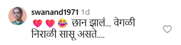 “ऋजुता ताईला भूमिका भारी मिळाल्या आहेत. ती त्या भूमिका उत्तम पद्धतीने निभावते. ‘कळत नकळत’, ‘रंग माझा वेगळा’ आणि ‘आता लग्नानंतर होईलच प्रेम’ या मालिकांमधील तिच्या भूमिका उत्तम आहेत”, “अशी सासू सगळ्यांना मिळाली तर बरं होईल. तुमचं वेगळेपण भारी, जगात भारी अभिनय, कमाल”, “छान झालं, वेगळी निराळी सासू असते, “विक्रम देशमुख बरोबर जी भांडणे होत आहेत, त्यात तुमची ॲक्टिंग आणि डायलॉग्ज कमाल आहेत”, “मला तर या आई खूपच आवडतात. अतिशय छान, प्रिय आणि दमदार व्यक्तिमत्व”, “तुम्ही खूप मस्त आहात, मानिनी काकू”, अशा अनेक कमेंट्स करत चाहत्यांनी अभिनेत्रीच्या पात्राचे, तिच्या अभिनयाचे कौतुक केले आहे.