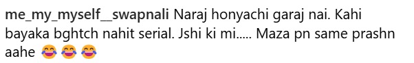 स्वप्नील पवारने शेअर केलेल्या या व्हिडीओवर नेटकऱ्यांनी अनेक मजेशीर कमेंट्स केल्या आहेत. एका नेटकऱ्याने लिहिले, “आत्याबरोबर मीसुद्धा विचारत आहे कुठल्या सीरियलमध्ये काम केलंय?”, दुसर्या नेटकऱ्याने लिहिले, “इतकं खरं बोलायचं नव्हतं”, असे म्हणत हसण्याची इमोजी शेअर केली आहे. एका नेटकऱ्याने लिहिले, “नाराज होण्याची गरज नाही. काही बायका मालिका बघतच नाहीत. जशी की मी, माझासुद्धा तोच प्रश्न आहे.” आणखी एका नेटकऱ्याने लिहिले, “सत्याची भूमिका बघ म्हण; दारात सोड फोनसुद्धा येणार नाही.” दुसऱ्या एका नेटकऱ्याने लिहिले, “लाख जणांच्या प्रयत्नात एक आत्या’ मालिकेचं नाव सांग बिनधास्त”, तर अनेकांनी हसण्याच्या इमोजी शेअर केल्या आहेत.