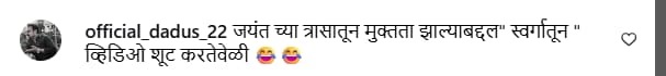 तर आणखी काही कमेंट्स पाहायला मिळत आहेत. “जयंतच्या त्रासातून मुक्तता झाल्यानंतर स्वर्गातून व्हिडीओ शूट करतेवेळी”, “जानू लक्ष्मी निवासमध्ये परत ये”, “अरे, जानू समुद्रातून बाहेर आली”, “आता कमबॅक करा”, “जानू पाण्यातून बाहेर आली. आता लपून बस”, “जानू, काळजी करू नकोस, तुला विश्वा न्यायला येईल”, अशा अनेक कमेंट्स पाहायला मिळत आहेत.
