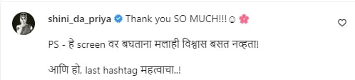 ओंकार राऊतच्या या पोस्टवर प्रियदर्शनीनेही प्रतिक्रिया दिली आहे. “खूप खूप धन्यवाद!! PS – हे screen वर बघताना मलाही विश्वास बसत नव्हता! आणि हो, last hashtag महत्वाचा..!” असे तिने कमेंट करताना म्हटले आहे.