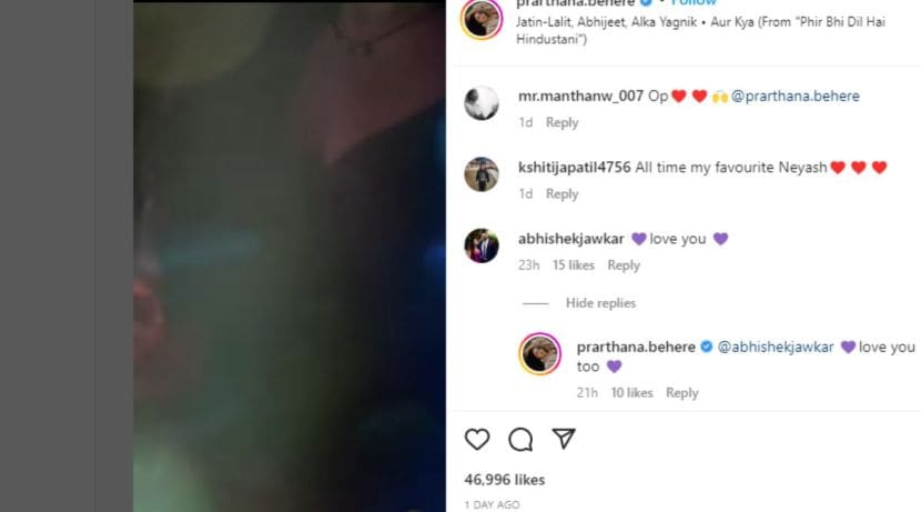 आपल्या पत्नीचा हा सुंदर व्हिडीओ पाहून अभिषेकने तिला कमेंटच्या माध्यमातून “आय लव्ह यू” असं म्हटलं आहे. तसेच प्रार्थनानेही त्याला प्रतिसाद देत “आय लव्ह यू टू” म्हणत नवऱ्यावर प्रेम व्यक्त केलं. सध्यातरी यश-नेहाचा हा व्हिडीओ प्रेक्षकांच्याही विशेष पसंतीस पडत आहे.