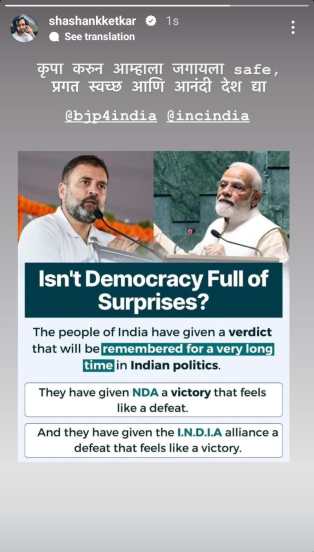 याशिवाय शशांकची पत्नी प्रियांका केतकरने देखील लोकसभा निवडणुकीचा निकाल जाहीर झाल्यानंतर पंतप्रधान नरेंद्र मोदी यांची पोस्ट इन्स्टाग्रामवर स्टोरीवर शेअर केली होती.