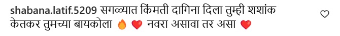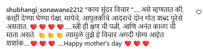 “खरंच खूप सुंदर अर्थपूर्ण व्हिडिओ”, “किती सुंदर विचार आहेत. आपुलकीचे आदराचे महत्त्वाचे विचार आहेत”, “शशांक केतकर सगळ्यात किमती तुम्ही तुमच्या बायकोला दागिना दिला. नवरा असावा तर असा”, “खूप सुंदर”, “तुमच्या कुटुंबाला खूप आशीर्वाद”, अशा कमेंट करीत चाहत्यांनी शशांकचे कौतुक केले आहे. तर अभिनेत्री रेश्मा शिंदेनेदेखील हार्ट इमोजी शेअर केली आहे. अभिनेत्याने आईसाठीदेखील व्हिडीओ शेअर केला आहे.
