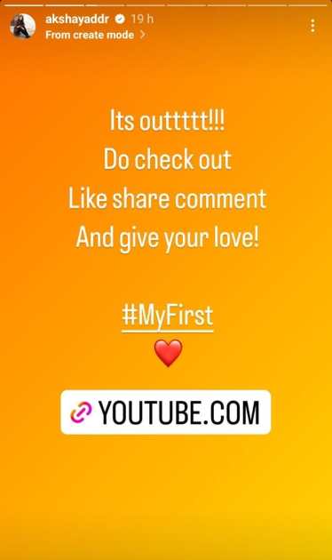 अक्षयाने तिच्या इन्स्टाग्राम अकाउंटवर एक स्टोरी शेअर केली. यामध्ये तिने तिचा स्वतःचा यूट्यूब चॅनल सुरू केल्याचं चाहत्यांची शेअर केलं. याचबरोबर तिने या स्टोरीमध्ये या नव्या यूट्यूब चॅनलची लिंक देऊन तिच्या चाहत्यांना हे चॅनल सबस्क्राइब करण्याचीही विनंती केली. नुकतीच वटपौर्णिमा झाली आणि या तिच्या पहिल्या वटपौर्णिमेचा व्हिडीओ तिने तिच्या यूट्यूब चॅनलवर पोस्ट करत या तिच्या नवीन व्हेंचरचा शुभारंभ केला. या तिच्या वटपौर्णिमेच्या व्हिडीओमध्ये ती पिवळ्या रंगाची साडी नेसून वडाच्या झाडाची पूजा करताना दिसत आहे.