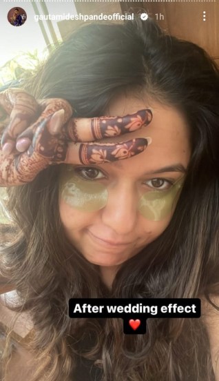 गौतमीने इन्स्टाग्राम स्टोरीवर लग्नानंतरची अवस्था शेअर केली आहे. ज्यामध्ये ती विक्ट्रीच साइन करताना दिसत आहे. तसेच तिच्या डोळ्याखाली अन्डर आय पॅचेस लावलेलं पाहायला मिळत आहे. हा फोटो शेअर करत गौतमीने लिहिलं आहे, “लग्नानंतरचा परिणाम.”