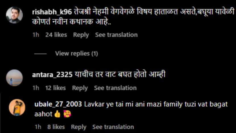 तेजश्रीच्या या व्हिडीओवर चाहते लाईक्स आणि प्रतिक्रियेच्या माध्यमातून भरभरून प्रेम व्यक्त करत आहेत. एका चाहत्यानं लिहिलं आहे की, “तेजश्री नेहमी वेगवेगळे विषय हाताळत असते, बघूया यावेळी कोणतं नवीन कथानक आहे?” तर दुसऱ्या चाहतीनं लिहिलं आहे की, “आम्ही याचीच तर वाट बघत होतो.” तसेच तिसऱ्या चाहतीनं लिहिलं आहे की, “लवकर ये ताई, मी आणि माझे कुटुंब तुझी वाट बघतं आहोत.”