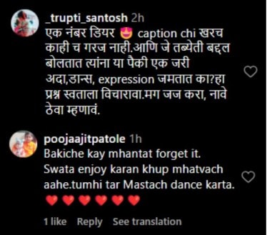 विशाखाच्या या पोस्टवर तिच्या चाहत्यांनी भरभरून कमेंट केल्या आहेत. एका नेटकरीनं लिहीलं आहे की, “एक नंबर… कॅप्शनची खरच काहीच गरज नाही आणि जे तब्येतीबद्दल बोलतात त्यांना यापैकी एक जरी अदा, डान्स, एक्स्प्रेशन जमतात का? हा प्रश्न स्वतःला विचारावा. मग जज करा, नाव ठेवा म्हणावं.” तर दुसऱ्या नेटकरीनं लिहीलं आहे की, “बाकीचे काय म्हणतात हे विसरून जा. स्वतः एन्जॉय करणं खूप महत्त्वाचं आहे. तुम्ही तर मस्तच डान्स करता.”