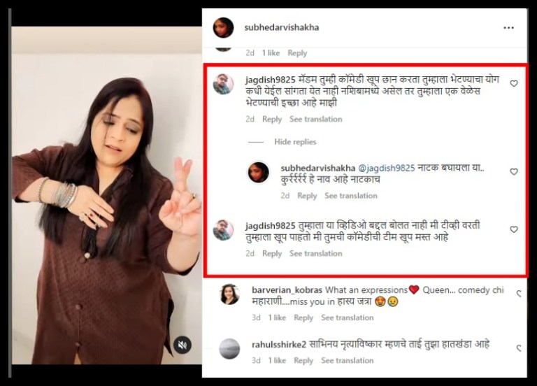 विशाखा सुभेदारच्या जगदीश नावाच्या एका चाहत्याने कमेंट केली आहे. “मॅडम तुम्ही कॉमेडी खूप छान करता तुम्हाला भेटण्याचा योग कधी येईल सांगता येत नाही. नशिबामध्ये असेल तर तुम्हाला एक वेळेस भेटण्याची इच्छा आहे माझी”, असे त्याने म्हटले. त्यावर विशाखा सुभेदारने प्रतिक्रिया दिली आहे. “नाटक बघायला या…कुर्रर्रर्रर्र हे नाव आहे नाटकाचं”, असे तिने म्हटले आहे.