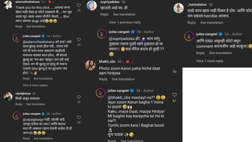 चौथ्या नेटकऱ्याने लिहिलं, “हे दोघं एवढे काय खास दिसत नाही आणि फोटो पण एकदम भयानक आहे.” या प्रतिक्रियेवर गायिका म्हणाली, “आणि एवढा असूनही फोट बघून प्रतिक्रिया करायचीच आहे काकूंना.” आणखी एका नेटकऱ्याने लिहिलं, “फोटो झूम करून हिच्या दात आणि हिरड्या पाहा.” या नेटकऱ्याला जुईलने चोख उत्तर दिलं. ती म्हणाली, “मस्त आहे ना? अजून झूम करून बघा नसा देखील दिसतील. काकू…माझे दात, माझ्या हिरड्या. मी बघेन काय करायचं ते. हो की नाही? तुम्ही झूम करा. बघत बसा.”