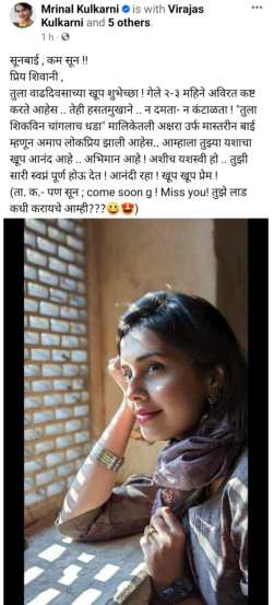 त्यांनी सोशल मीडियावर शिवानीचा एक फोटो शेअर करत लिहिलं, “सूनबाई, कम सून !! प्रिय शिवानी, तुला वाढदिवसाच्या खूप शुभेच्छा ! गेले २-३ महिने अविरत कष्ट करते आहेस .. तेही हसतमुखाने… न दमता-न कंटाळता ! “तुला शिकविन चांगलाच धडा” मालिकेतली अक्षरा उर्फ मास्तरीन बाई म्हणून अमाप लोकप्रिय झाली आहेस. आम्हाला तुझ्या यशाचा खूप आनंद आहे. अभिमान आहे ! अशीच यशस्वी हो.. तुझी सारी स्वप्नं पूर्ण होऊ देत ! आनंदी रहा ! खूप खूप प्रेम ! (ता. क.- पण सून, come soon g ! Miss you! तुझे लाड कधी करायचे आम्ही?)