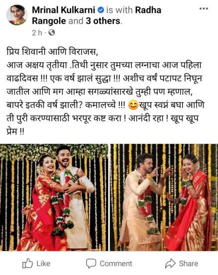 विराजस आणि शिवानीच्या लग्नातले दोन फोटो पोस्ट करत त्यांनी लिहिलं, “प्रिय शिवानी आणि विराजस, आज अक्षय तृतीया. तिथी नुसार तुमच्या लग्नाचा आज पहिला वाढदिवस !!! एक वर्ष झालं सुद्धा !!! अशीच वर्षं पटापट निघून जातील आणि मग आम्हा सगळ्यांसारखे तुम्ही पण म्हणाल, बापरे इतकी वर्ष झाली? कमालच्चे !!! खूप स्वप्नं बघा आणि ती पुरी करण्यासाठी भरपूर कष्ट करा ! आनंदी राहा ! खूप खूप प्रेम !!”