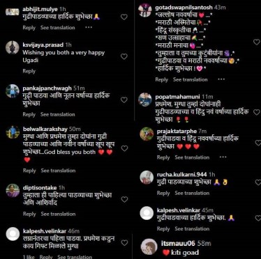 मुग्धाच्या या पोस्टवर नेटकऱ्यांनी भरभरून प्रतिक्रिया दिल्या आहेत. नेटकऱ्यांनी मुग्धा व प्रथमेशला पहिल्या गुढीपाडव्याच्या शुभेच्छा दिल्या आहेत. “तुम्हाला पहिल्या पाडव्याच्या शुभेच्छा आणि आशीर्वाद”, “किती गोड दिसताय”, अशा प्रतिक्रिया नेटकऱ्यांनी दिल्या आहेत. शिवाय एका नेटकऱ्याने विचारलं, “लग्नानंतरचा पहिला पाडवा. प्रथमेशकडून काय गिफ्ट मिळालं मुग्धा?”