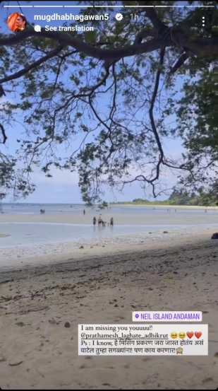मुग्धा वैशंपायन सध्या अंदमान दौऱ्यावर आहे. ती या दौऱ्यात एकटीच असल्यामुळे तिला पती प्रथमेशची आठवण येत आहे. त्यानिमित्ताने मुग्धाने इन्स्टाग्रामवर स्टोरी शेअर केली आहे.