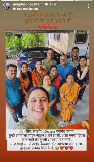 तिने त्यांचा एक फॅमिली फोटो इन्स्टाग्राम स्टोरीवर शेअर करत लिहिलं, “प्रिय, लाडके, डिअरेस्ट देवानंद काका, तुम्ही आम्हाला सोडून जाऊन ३ वर्ष झाली. असा एकही दिवस जात नाही की तुमची आठवण येत नाही… आज माझं आणि ताईचं केळवण होतं आपल्या खानावला.. तुम्हाला अशक्य मिस केलं…” तर यामधून मुग्धाबरोबरच मुग्धाची बहीणही लवकरच विवाह बंधनात अडकणार असल्याचं समोर आलं.