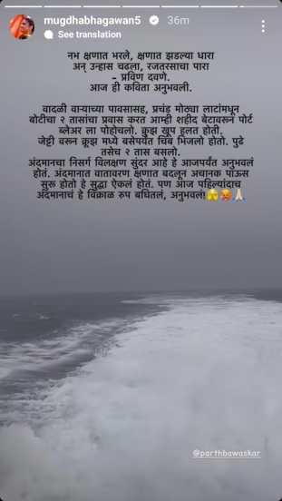 पुढे मुग्धाने लिहिलं आहे, “वादळी वाऱ्याच्या पावसासह, प्रचंड मोठ्या लाटांमधून बोटीचा २ तासांचा प्रवास करत आम्ही शहीद बेटावरून पोर्ट ब्लेअरला पोहोचलो. क्रूझ खूप हलत होती. जेट्टीवरून क्रूझमध्ये बसेपर्यंत चिंब भिजलो होतो. पुढे तसेच २ तास बसलो. अंदमानचा निसर्ग विलक्षण सुंदर आहे हे आजपर्यंत अनुभवलं होतं. अंदमानात वातावरण क्षणात बदलून अचानक पाऊस सुरू होतो हे सुद्धा ऐकलं होतं. पण आज पहिल्यांदाच अंदमानाचं हे विक्राळ रुप बघितलं, अनुभवलं.”