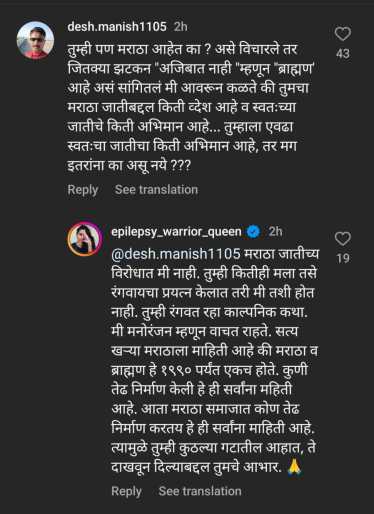 केतकीची ही पोस्ट सोशल मीडियावर चांगलीच व्हायरल झाली आहे. एका नेटकऱ्याने अभिनेत्रीच्या या पोस्टवर लिहिलं आहे, “तुम्ही पण मराठा आहेत का? असं विचारलं तर जितक्या झटकन ‘अजिबात नाही’ म्हणून ‘ब्राह्मण’ आहे असं सांगितलं. यावरून कळतं की तुमचा मराठा जातीबद्दल किती द्वेष आहे व स्वतःच्या जातीचा किती अभिमान आहे…तुम्हाला एवढा स्वतःचा जातीचा अभिमान आहे, तर मग इतरांना का असू नये?” या नेटकऱ्यांच्या प्रतिक्रियेवर उत्तर देत केतकी म्हणाली, “मराठा जातीच्या विरोधात मी नाही. तुम्ही कितीही मला तसे रंगवायचा प्रयत्न केलात तरी मी तशी होत नाही. तुम्ही रंगवत राहा काल्पनिक कथा. मी मनोरंजन म्हणून वाचत राहते. सत्य खऱ्या मराठाला माहिती आहे की मराठा व ब्राह्मण हे १९९० पर्यंत एकच होते. कुणी तेढ निर्माण केली हे ही सर्वांना महिती आहे. आता मराठा समाजात कोण तेढ निर्माण करतंय हे ही सर्वांना माहिती आहे. त्यामुळे तुम्ही कुठल्या गटातील आहात, ते दाखवून दिल्याबद्दल तुमचे आभार.”