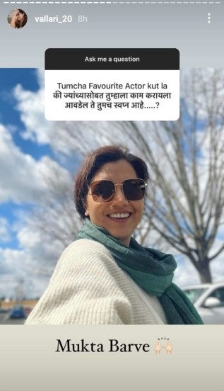 वल्लरी विराजने इन्स्टाग्रामवरील ‘आस्क मी सेशन’द्वारे चाहत्यांनी संवाद साधला. यावेळी चाहत्यांनी तिला आवडणाऱ्या कलाकारापासून ते तिचं शिक्षण असे अनेक प्रश्न विचारले. तिला एकदा चाहत्याने विचारलं की, तुझा आवडता कलाकार कोणता? ज्याबरोबर तुला काम करायला आवडेल ते तुझं स्वप्न आहे. यावर वल्लरीने अभिनेत्री मुक्ता बर्वेचा फोटो शेअर करून उत्तर दिलं.