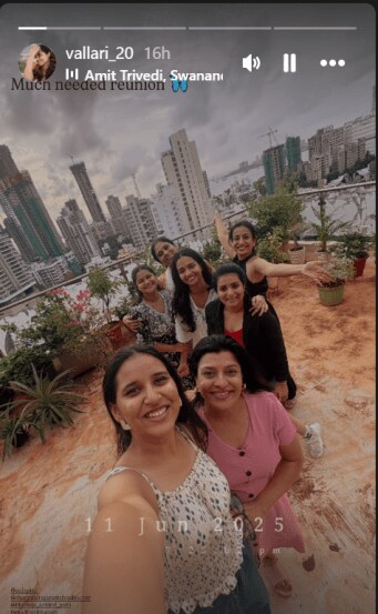 अभिनेत्री वल्लरी विराजने इन्स्टाग्राम स्टोरीवर काही फोटो शेअर केले. पहिल्या फोटोमध्ये वल्लरीसह, भूमिजा पाटील, भारती पाटील, शीतल क्षीरसागर, माधुरी भारती, शर्मिला शिंदे, आलापिनी या अभिनेत्री दिसत आहेत. हे फोटो शेअर करीत अभिनेत्रीने हे रियुनिअन गरजेचे होते असे लिहिले आहे.