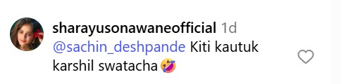 सचिनने हे फोटो शेअर करताना ‘वाकडतोंडी’ हे कॅप्शन दिले आहे. तसेच पुढे हसण्याच्या इमोजी शेअर केल्या आहेत. त्याचे हे कॅप्शन लक्ष वेधून घेत असल्याचे पाहायला मिळत आहे. त्याच्या या पोस्टवर शरयूसह चाहत्यांनी कमेंट केल्याचे पाहायला मिळत आहे. शरयूने सचिनने शेअर केलेल्या पोस्टवर कमेंट करीत लिहिले, “स्वत:चं किती कौतुक करशील”, असे लिहित तिने पुढे हसण्याच्या इमोजी शेअर केल्याचे पाहायला मिळत आहे.