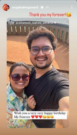 प्रथमेशने इन्स्टाग्राम स्टोरीवर दोघांचा फोटो शेअर करून लिहिलं आहे, “वाढदिवसाच्या खूप खूप शुभेच्छा माय फॉरेव्हर.” प्रथमेशने या खास अंदाजात दिलेल्या शुभेच्छा पाहून मुग्धाने त्याचे आभार मानले आहेत.