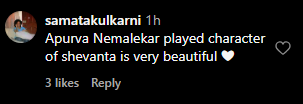 अपूर्वाने शेअर केलेला हा व्हिडीओ पाहून एका नेटकऱ्यानं लिहिलं आहे की, “अपूर्वा तू निभावलेली शेवंताची भूमिका खूप भारी होती.” तर दुसऱ्या नेटकऱ्यानं लिहिलं आहे की, “कोट्यवधी हृदयाची राणी शेवंता आहे.”