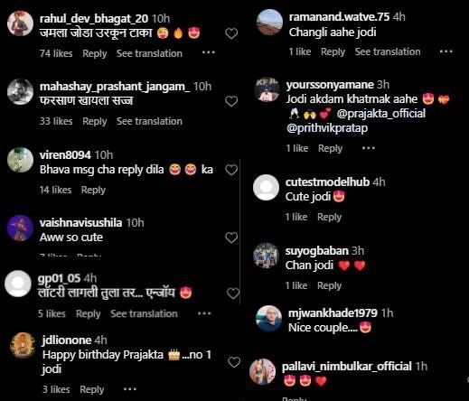 काही नेटकऱ्यांनी प्राजक्ताला वाढदिवसाच्या शुभेच्छा दिल्या आहेत. पण काही नेटकऱ्यांनी पृथ्वीक ( Prithvik Pratap ) व प्राजक्ताच्या जोडीचं कौतुक केलं आहे. एका नेटकऱ्याने लिहिलं आहे, “जमला जोडा उरकून टाका.” तर दुसऱ्या नेटकऱ्याने लिहिलं आहे, “तुला तर लॉटरी लागली…एन्जॉय.” तर तिसऱ्या नेटकऱ्याने लिहिलं आहे, “जोडी चांगली आहे.” चौथ्या नेटकऱ्याने लिहिलं आहे, “जोडी एकदम खतरनाक आहे.” अशा प्रकारच्या अनेक प्रतिक्रिया नेटकऱ्यांनी दिल्या आहेत.