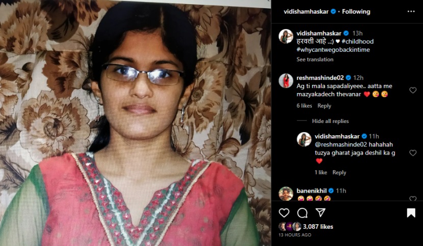 चष्मा घातलेली आणि निरासग चेहरा असलेली ही अभिनेत्री म्हणजे विदिशा म्हसकर. विदिशाने हा बालपणीचा फोटो नुकताच शेअर केला आहे. ‘हरवली आहे’ असं कॅप्शन देत तिने हा फोटो शेअर केला आहे. या फोटोवर कलाकार मंडळींसह चाहत्यांनी भरभरून प्रतिक्रिया दिल्या आहेत. ‘रंग माझा वेगळा’ मालिकेतील दीपा म्हणजे अभिनेत्री रेश्मा शिंदेने प्रतिक्रिया देत लिहीलं आहे की, अगं ती मला सापडली आहे. आता मी माझ्याकडेच ठेवणार आहे. यावर विदिशाने म्हणाली, “हाहाहा…तुझ्या घरात जागा देशील का गं?”