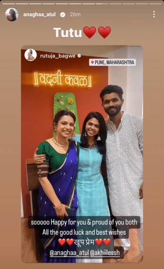 अभिनेत्रीला शुभेच्छा देताना ऋतुजा लिहिते, “मला तुझा प्रचंड अभिमान वाटते…पुढील वाटचालीसाठी तुला खूप खूप शुभेच्छा! खूप प्रेम…लव्ह यू खूप अन्नदाता सुखी भव:” दरम्यान, मराठी कलाविश्वातील कलाकारमंडळींसह नेटकऱ्यांनी अनघावर शुभेच्छांचा वर्षाव केला आहे.