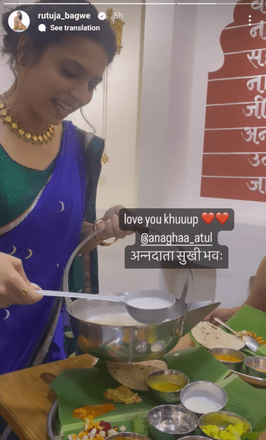 अनघा अतुलने सुरू केलेल्या ‘वदनी कवळ’ हॉटेलमध्ये येणाऱ्या खवय्यांना शुद्धा शाकाहारी पारंपरिक थाळीचा आस्वाद घेता येणार आहे. ऋतुजाने या हॉटेलमध्ये मिळणाऱ्या थाळीचा एक व्हिडीओ तिच्या इन्स्टाग्रामवर शेअर केला आहे. यामध्ये अनघा तिला सीताफळ रबडी वाढताना दिसत आहे. अनघाने तिचा भाऊ अखिलेश भगरेच्या साथीने या नव्या व्यवसायाची सुरूवात केली आहे.