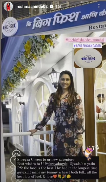 रेश्मा व श्रेया खूप चांगल्या मैत्री आहेत. रेश्माने श्रेयाच्या नव्या रेस्टॉरंट बाहेरचा फोटो इन्स्टाग्राम स्टोरीला शेअर करत लिहिलं, “श्रेया तुला नव्या साहसासाठी खूप साऱ्या शुभेच्छा…बऱ्याच दिवसांनंतर खूप छान, स्वादिष्ट जेवण जेवले. त्यामुळे माझं पोट खूप भरलं. तुला खूप साऱ्या शुभेच्छा आणि प्रेम…”
