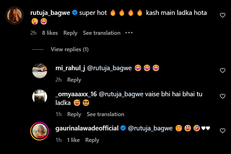 गौरीने पोस्ट केलेल्या या फोटोजवर अनेक चाहत्यांच्या तसेच कलाकारांच्यादेखील कमेंट्स आल्या आहेत. यातलीच एक कमेंट सध्या चर्चेचा विषय ठरली आहे. ‘नांदा सौख्य भरे’, ‘चंद्र आहे साक्षीला’ अशा मालिकांमधून प्रेक्षकांचं मनोरंजन करणारी अभिनेत्री ऋतुजा बागवे हिने गौरीच्या या फोटोवर खास कमेंट केली आहे. “सुपर हॉट, काश मैं लडका होता” (जर मी मुलगा असते तर…) अशी लक्ष वेधणारी कमेंट ऋतुजाने केली आहे. यावर रिप्लाय म्हणून गौरीने हसण्याचं आणि हार्ट इमोजी वापरलं आहे.