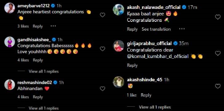 सध्या अभिनेत्रीने नवी गाडी घेतल्यामुळे कलाकार मंडळींसह चाहते तिच्यावर शुभेच्छांचा वर्षाव करत आहेत. ‘सहकुटुंब सहपरिवार’ मालिकेतील वैभव म्हणजेच अभिनेता अमेय बर्वेने कोमलच्या पोस्टवर प्रतिक्रिया देत लिहीलं आहे की, “अंजी मनापासून अभिनंदन,” तसेच अभिनेत्री साक्षी गांधी, रेश्मा शिंदे, गिरीजा प्रभु, आकाश नलावडे यांनी देखील तिला शुभेच्छा दिल्या आहेत.