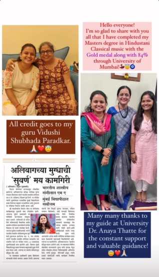 मुग्धाने तिच्या गुरु विदुषी शुभदा पराडकर आणि तिच्या एम.एच्या गाईड डॉ. अनाया थत्ते यांच्याबरोबरचे फोटो शेअर करत लिहिलं, “मला हे तुम्हाला सांगताना अत्यंत आनंद होत आहे की मी मुंबई युनिव्हर्सिटीतून हिंदुस्तानी शास्त्रीय संगीतात गोल्ड मेडल आणि ८४% मिळवत मास्टर डिग्री यशस्वीरीत्या पूर्ण केली आहे. याचं संपूर्ण श्रेय माझ्या गुरु विदुषी शुभदा पराडकर यांना जातं. याचबरोबर मला मार्गदर्शन केल्याबद्दल माझ्या एम.एच्या गाईड डॉक्टर अनया थत्ते यांचे मनापासून आभार.”