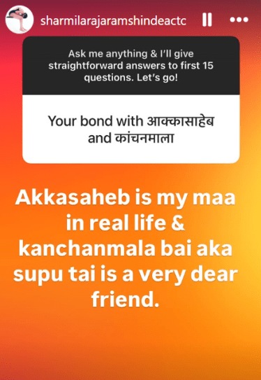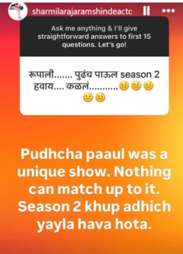 त्याबरोबरच तिला ‘पुढचं पाऊल’ या मालिकेचा दुसरा सीझन आला पाहिजे, असे एका चाहत्याने म्हटले. त्यावर शर्मिलाने लिहिले, “पुढचं पाऊल हा खूप अनोखा कार्यक्रम होता. त्याची बरोबरी होऊच शकत नाही. सीझन २ आधीच यायला पाहिजे होता.” आणखी एका चाहत्याने विचारले की, तुझं आक्कासाहेब आणि कांचनमाला यांच्याबरोबरचे बॉण्डिंग कसे आहे? त्यावर उत्तर देताना शर्मिला शिंदेने लिहिले, “खऱ्या आयुष्यात आक्कासाहेब माझ्या आईसारख्या आहेत आणि कांचनमाला म्हणजेच सुप्रियाताई माझी जवळची मैत्रीण आहे.” पुढचं पाऊल या मालिकेने २०१७ साली प्रेक्षकांचा निरोप घेतला.