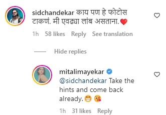 त्यावर मितालीनेही प्रतिक्रिया दिली आहे. सिद्धार्थने केलेल्या या कमेंटवर मितालीने “इशारा समज आणि परत ये” अशी प्रतिक्रिया दिली आहे. दरम्यान या दोघांच्या या संभाषणाचे फोटो सध्या व्हायरल होत आहेत.