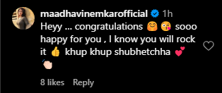 कपिलच्या या पोस्टवर शालिनी म्हणजे अभिनेत्री माधवी निमकरने प्रतिक्रिया दिली आहे. माधवी म्हणाली, “हे…अभिनंदन…तुझ्यासाठी खूप आनंदी आहे. मला माहितीये तू चांगलंच करशील…खूप खूप शुभेच्छा.”