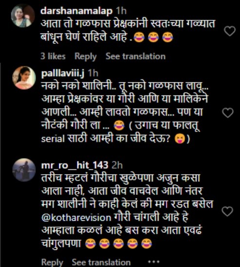 एका नेटकरीनं लिहीलं आहे की, “आता तो गळफास प्रेक्षकांनी स्वतःच्या गळ्यात बांधून घेणं राहीलं आहे.” तसेच दुसऱ्या नेटकरीनं लिहीलं आहे की, “काय फालतूपणा आहे हा.” तर तिसऱ्या नेटकरीनं लिहीलं आहे की, “नको नको शालिनी…तू नको गळफास लावू… आम्हा प्रेक्षकांवर या गौरी आणि या मालिकेने ती वेळ आणली आहे… आम्ही लावतो गळफास… पण या नौटंकी गौरीला … (उगाच या फालतू मालिकेसाठी आम्ही का जीव देऊ?)” चौथ्या नेटकऱ्यानं लिहीलं आहे की, “तरीच म्हटलं गौरीचा खुळेपणा अजून कसा आला नाही? आता जीव वाचवेल आणि नंतर मग शालिनीने काही केलं की रडत बसेल.. कोठारे व्हिजन गौरी चांगली आहे हे आम्हाला कळलं आहे बस करा आता एवढा चांगुलपणा..”