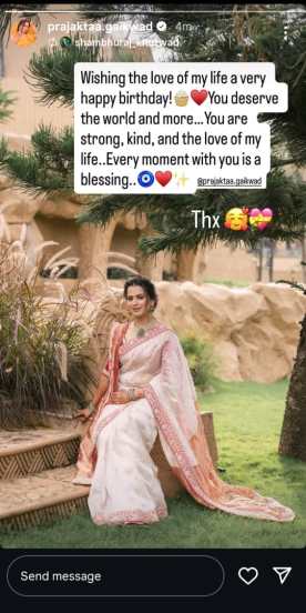 प्राजक्ताला तिच्या चाहत्यांबरोबर तिचा होणारा नवरा शंभुराज खुटवड यानंदेखील इन्स्टाग्राममार्फत तिला खास शुभेच्छा दिल्या आहेत. शंभुराजनं प्राजक्ताचा फोटो शेअर करीत “माझ्या प्रेमाला वाढदिवसाच्या खूप खूप शुभेच्छा. तू खूप खंबीर आणि चांगली आहेस. तुझ्याबरोबरचा प्रत्येक क्षण माझ्यासाठी खूप खास आहे,” असं लिहिलं आहे. प्राजक्ता गायकवाडनं त्यावर धन्यवाद असं लिहिलेलं दिसतं. प्राजक्ताच्या वाढदिवसानिमित्त तिच्या चाहत्यांनी फटाके वाजवीत जल्लोष साजरा केल्याचं तिनं सोशल मीडियावर शेअर केलेल्या व्हिडीओमधून पाहायला मिळतं.
