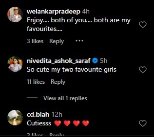 तेजश्री व अदितीच्या या व्हिडीओवर कलाकार मंडळीसह चाहत्यांनी प्रतिक्रिया दिल्या आहेत. ज्येष्ठ अभिनेते प्रदीप वेलणकर यांनी लिहिलं आहे, “दोघींनी खूप एन्जॉय करा…तुम्ही दोघीही माझ्या आवडत्या आहात.” तसेच निवेदिता सराफ यांनी देखील प्रतिक्रिया दिली आहे. त्यांनी लिहिलं आहे, “माझ्या दोन आवडत्या मुली…खूप छान.”