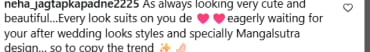 एका चाहत्याने लिहिले, “नवराई माझी”, दुसऱ्या एका चाहत्याने लिहिले, “पाहताना तुला चंद्रही लाजला”, असे लिहित पुढे हार्ट इमोजी शेअर केल्या आहेत. आणखी एका चाहत्याने लिहिले, “तू नेहमीप्रमाणेच खूप सुंदर दिसत आहेस. प्रत्येक लूकमध्ये तू खूप सुंदर दिसतेस. तुझा लग्नानंतरचा लूक आणि मंगळसूत्राची डिझाईन पाहण्यासाठी उत्सुक आहे.”